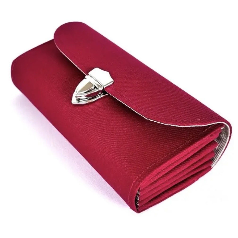 ダークレッドのツイル生地に厚手の芯を貼り製作しています。