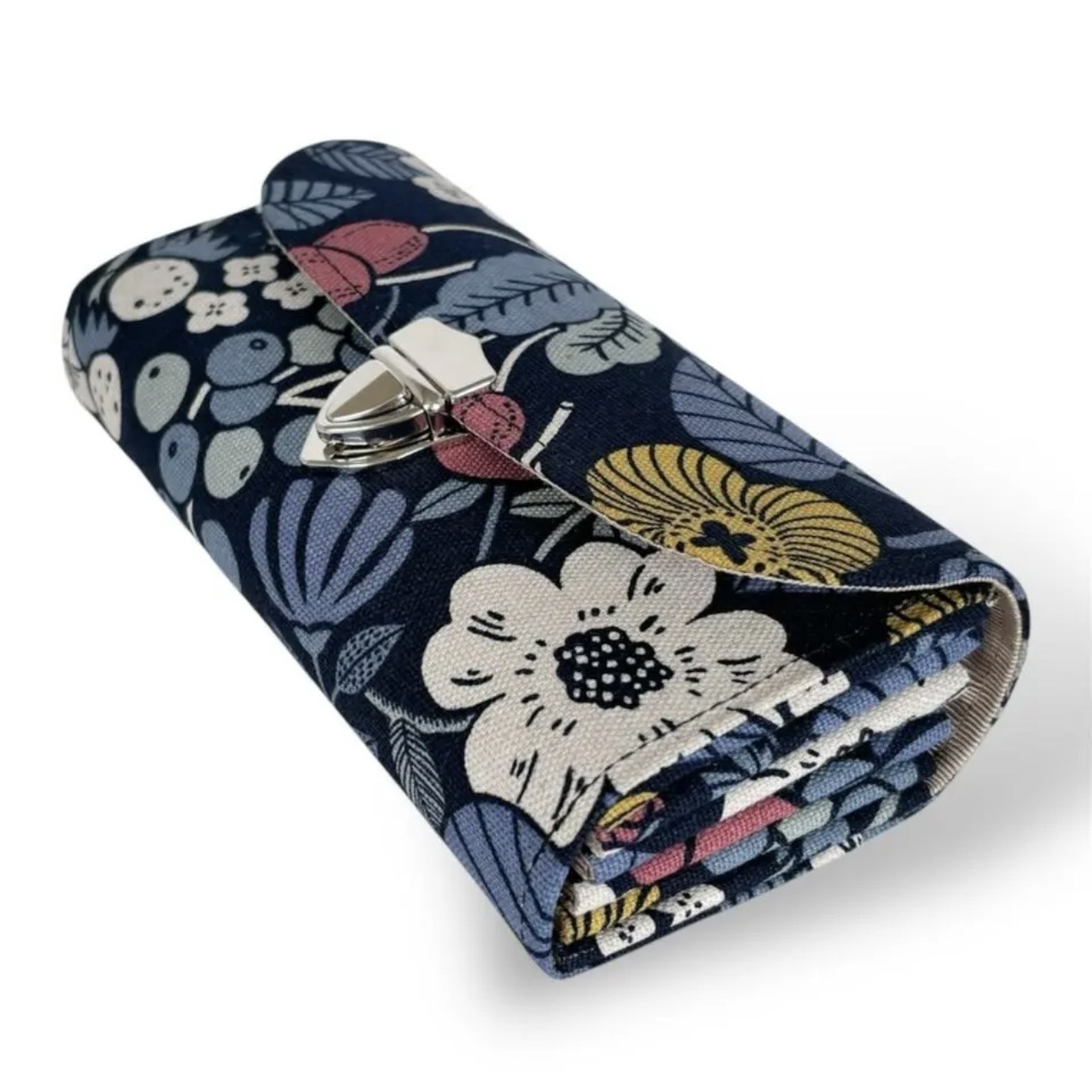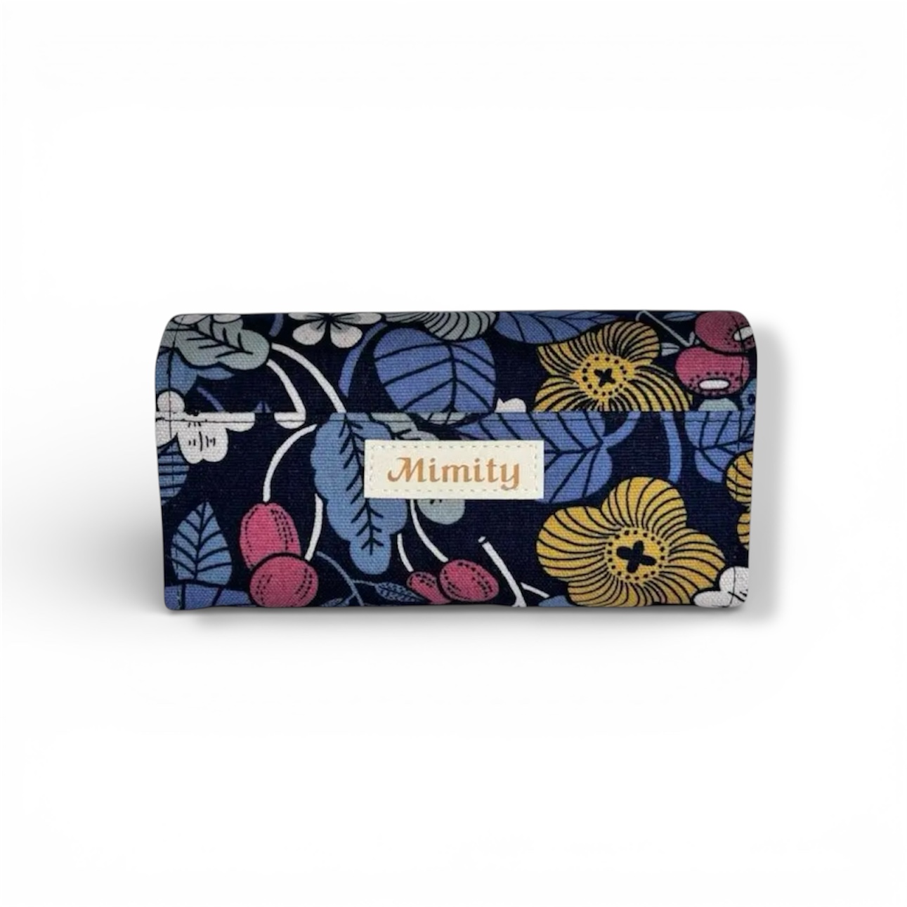 植物柄のネイビー色の綿麻キャンバス生地に厚手の芯を貼り製作しています。