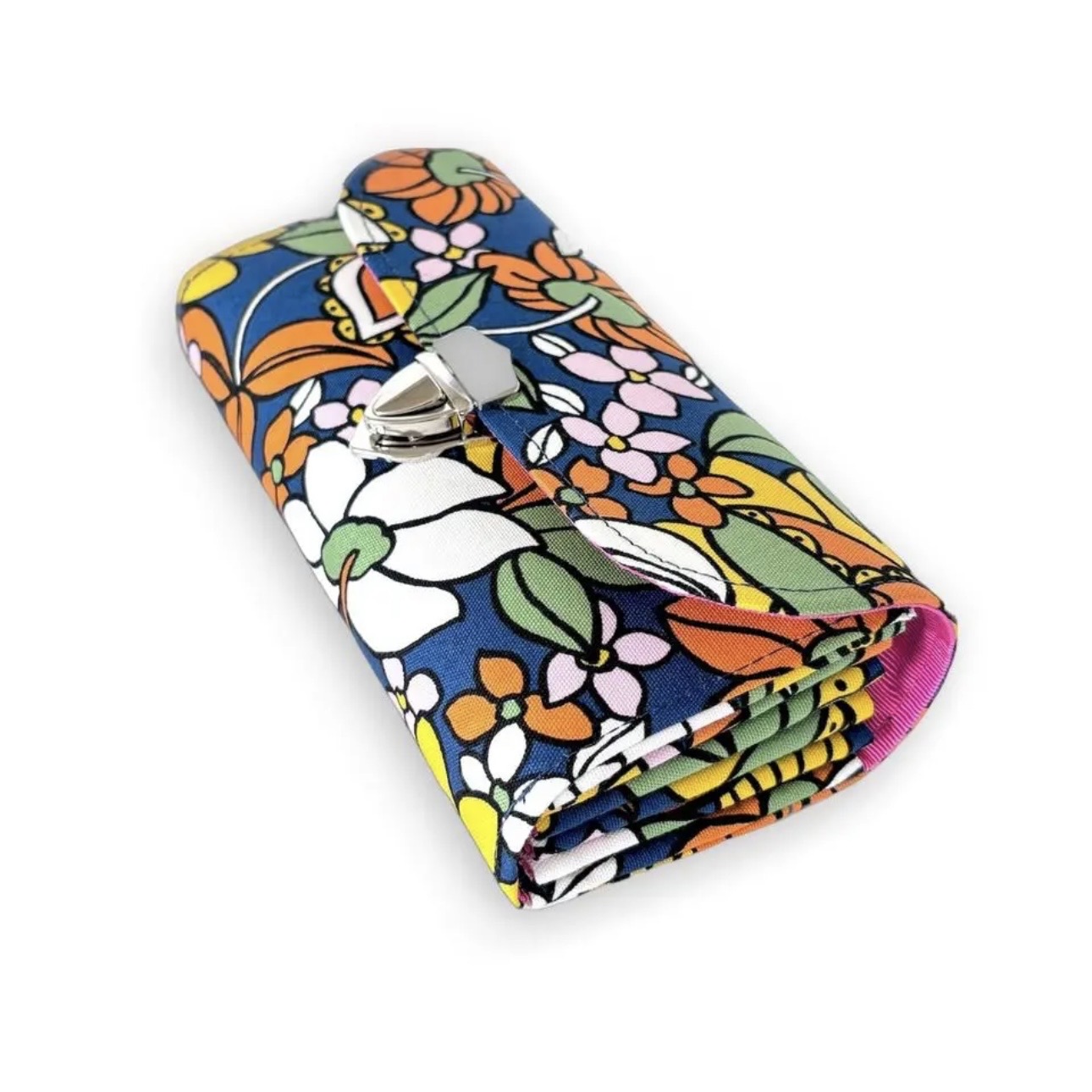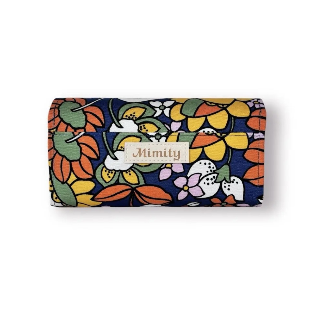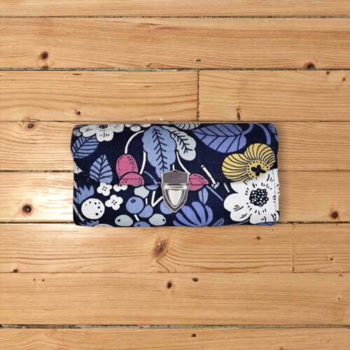 レトロな花柄のネイビー色のオックス生地に厚手の芯を貼り製作しています。
